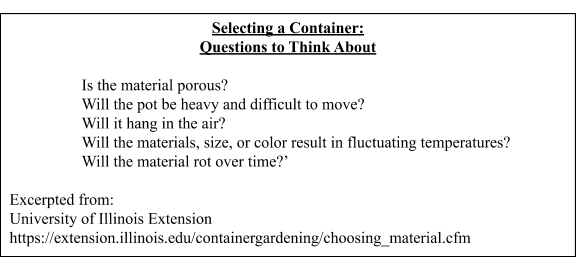 This article discusses the basic guidelines for growing plants in containers outside. Some ideas can be applied to houseplants; however, spring is the ideal time to plan for outdoor spaces. As with planning a special meal or a vacation trip, there are multiple strategies that can be followed. Getting ready can begin with choosing a container and acquiring other supplies, determining the location, and then selecting plants that fit the designated environment. Flowers, herbs, vegetables, and even trees and shrubs can thrive in containers when given care and attention.