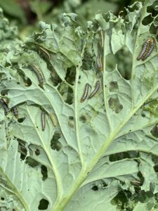 In June, cole crops (cabbage, broccoli, kale, collards etc.) will likely be invaded by a variety of cabbage worms, including loopers, imported cabbage moth worms and the cross-striped cabbage worm. They are tough to control but can be managed. Holes chewed in leaves and dark excrement piles on leaves are signs of attack. If hand picking, look for yellow eggs on the undersides of leaves as a start. Pull the caterpillars off leaves regularly; they do fast damage when uncontrolled. They can also be managed with row covers or with the organic pesticide Bacillus thuringiensis (Bt), available at garden centers. For more details, review U of Illinois Extension article Cabbageworm and 2025 Pest Management Guide: Home Grounds & Animals/VCE.Â