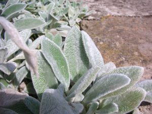 Closeup of Fuzzy Stachys (Lambs Ear) Foliage Fuzzy or woolly-looking foliage – The leaves of many gray or silver-leaved plants may also be covered with tiny hairs, giving the plant a fuzzy, woolly, or hairy look. The hairs reflect solar radiation, which helps to cool the leaf surface. In addition to slowing evaporation, they also capture moisture on the leaf surface and help offset the effects of drying winds.  Plants with fuzzy or woolly-looking leaves include dusty miller (Senecio cineraria), lamb’s ear (Stachys byzantine), silver sage (Salvia argentea), and licorice plant (Helichrysum petiolare).
