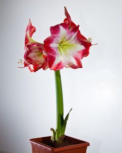 Amaryllis is another bulb that can be planted in time for holiday bloom. Although it now comes in a variety of colors, red amaryllis is perfect for the holiday season. You can also choose red with white edging, or white with red edging! Choose a 6-8″ pot heavy enough to prevent the plant from tipping over once the large flower is in bloom. Set the bulb in potting mix, pointy-side up, with about 1/3 of the bulb above the soil line. Place in bright, indirect light, and water sparingly until 2″ of growth appears. Then water regularly. It takes 6-8 weeks for the bulb to flower (although some bulbs bloom earlier, some later). See “Amaryllis,” The Garden Shed, November 2015, for information about planting amaryllis both indoors and in the garden.