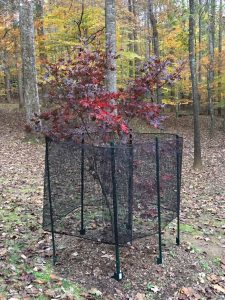 As the weather becomes harsher and natural food sources become scarcer, deer, rodents, rabbits and other animals will look to trees and shrubs as sources of food. Install tree guards, chicken wire, or stake and plastic fencing around young trees and woody shrubs to discouraging foraging and damage from antler rubbing. These photos show examples of protection against damage from deer rutting.