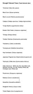 First, I should note that my list of drought and heat tolerant trees is still pretty solid; in fact, many on the list have been confirmed by recent research (the 2021 list is on the right; note that all listed trees were deemed drought tolerant, while those that were considered heat tolerant also are marked with an asterisk). Second, scientists seem to be discovering new and varied ways of assessing heat tolerance, a characteristic that is now considered critical by all concerned. In fact, heat tolerance has been the focus of most of the recent articles unearthed by my research. In view of the recent hot spells we’ve experienced, this focus makes perfect sense.