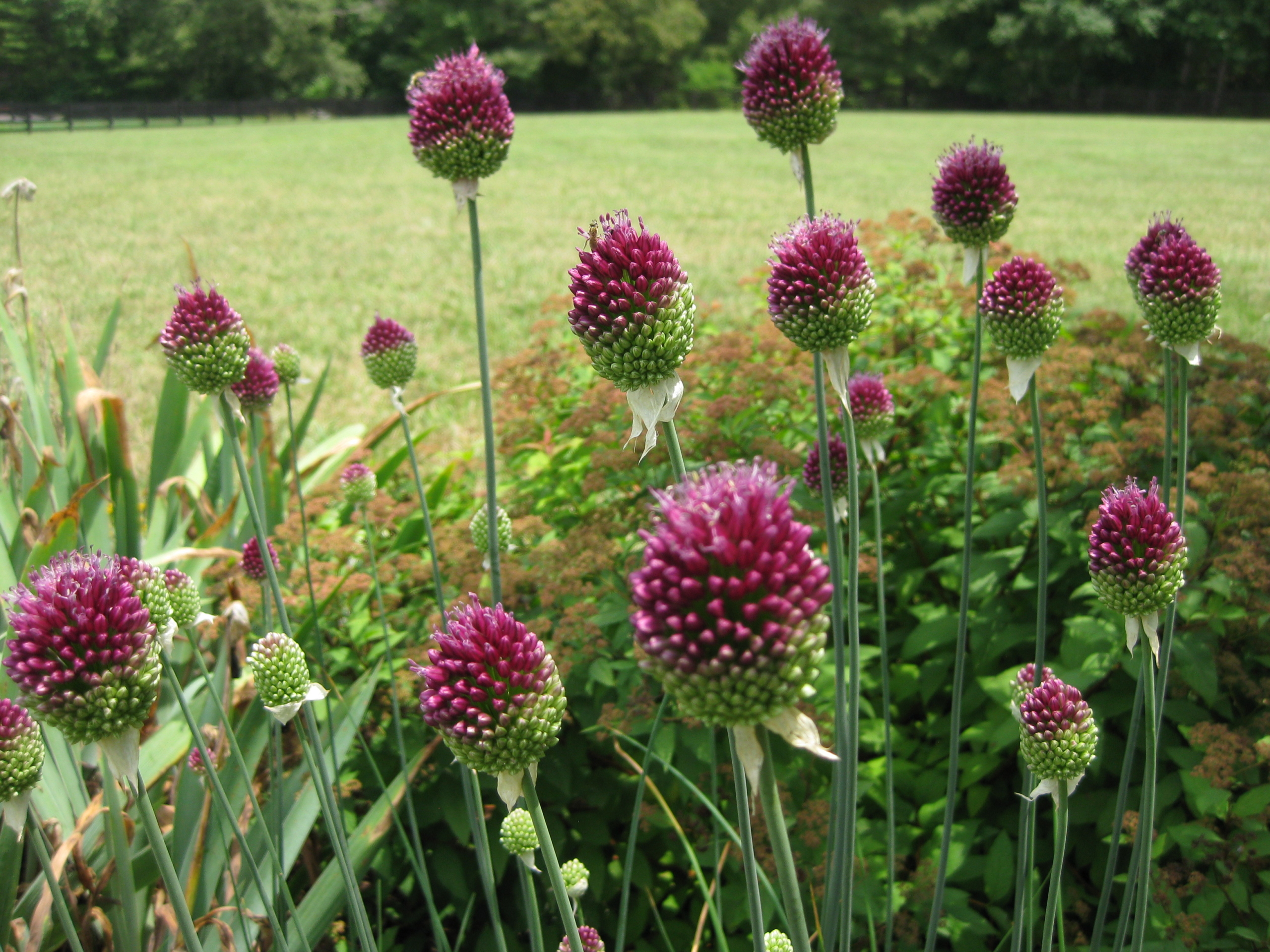Allium sphaerocephalon (Drumstick Allum) this later-blooming variety sports 1- to 2-in. wide egg-shaped, reddish-purple blossoms around June. This selection looks best planted in a large grouping. It can take a little more moisture than its siblings, particularly in the summer.