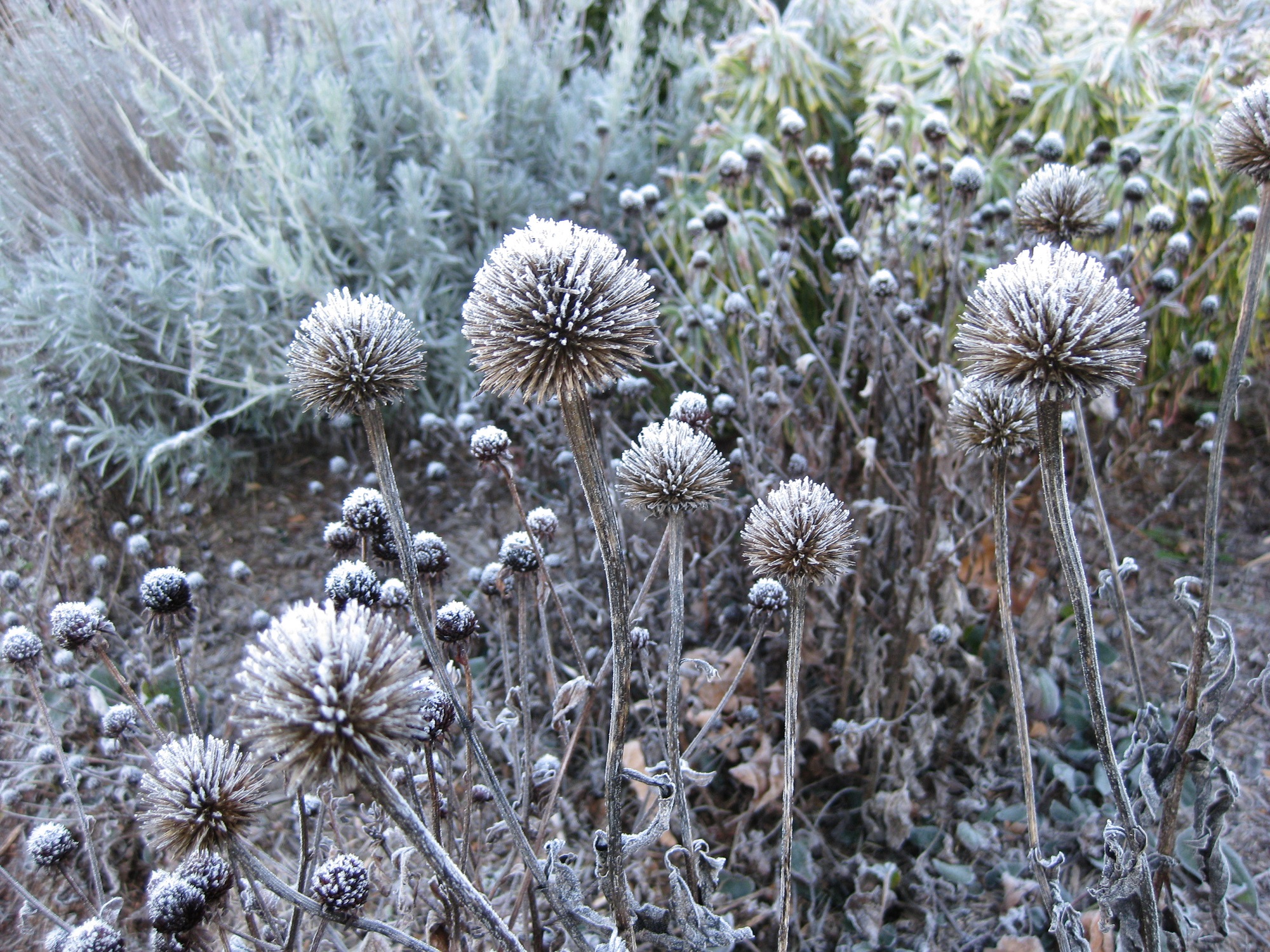 - Dried seed heads and seed pods of many plants, including tall sedum species, Echinacea, Clematis, and Rudbeckia, glimmer when coated in ice. Dried hydrangea flower heads catch the snow and rattle when stirred by a breeze. Dried milkweed (Asclepias) seedpods reveal attractive shimmery linings when split open, contrasting beautifully with the dark brown seeds.
