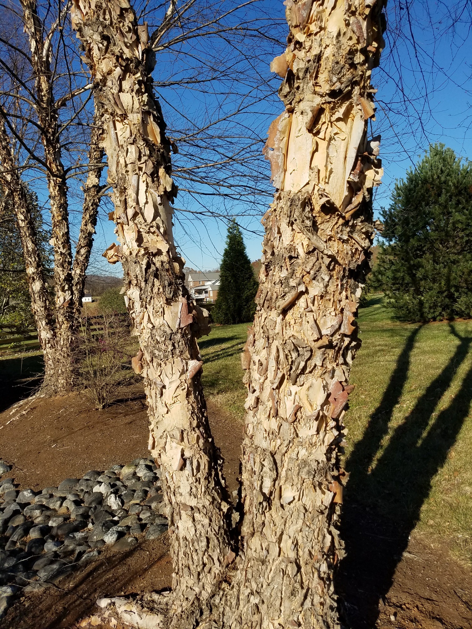 - River Birch (Betula nigra) bark exfoliates into papery sheets and plates, exposing various shades of brown, cinnamon, and gray on the underlying inner bark. This 40’ to 70’ species is perhaps the most heat tolerant of the native species. Don’t confuse this species with the paperbark birch (Betula papyrifera), which has the whitest bark of all the native U.S. birches, according to Michael Dirr’s Manual of Woody Landscape Plants. While a beautiful tree, the paperbark birch prefers the cooler temperatures of zones 2 to 6, whereas most of Virginia is in warmer USDA Zone 7.