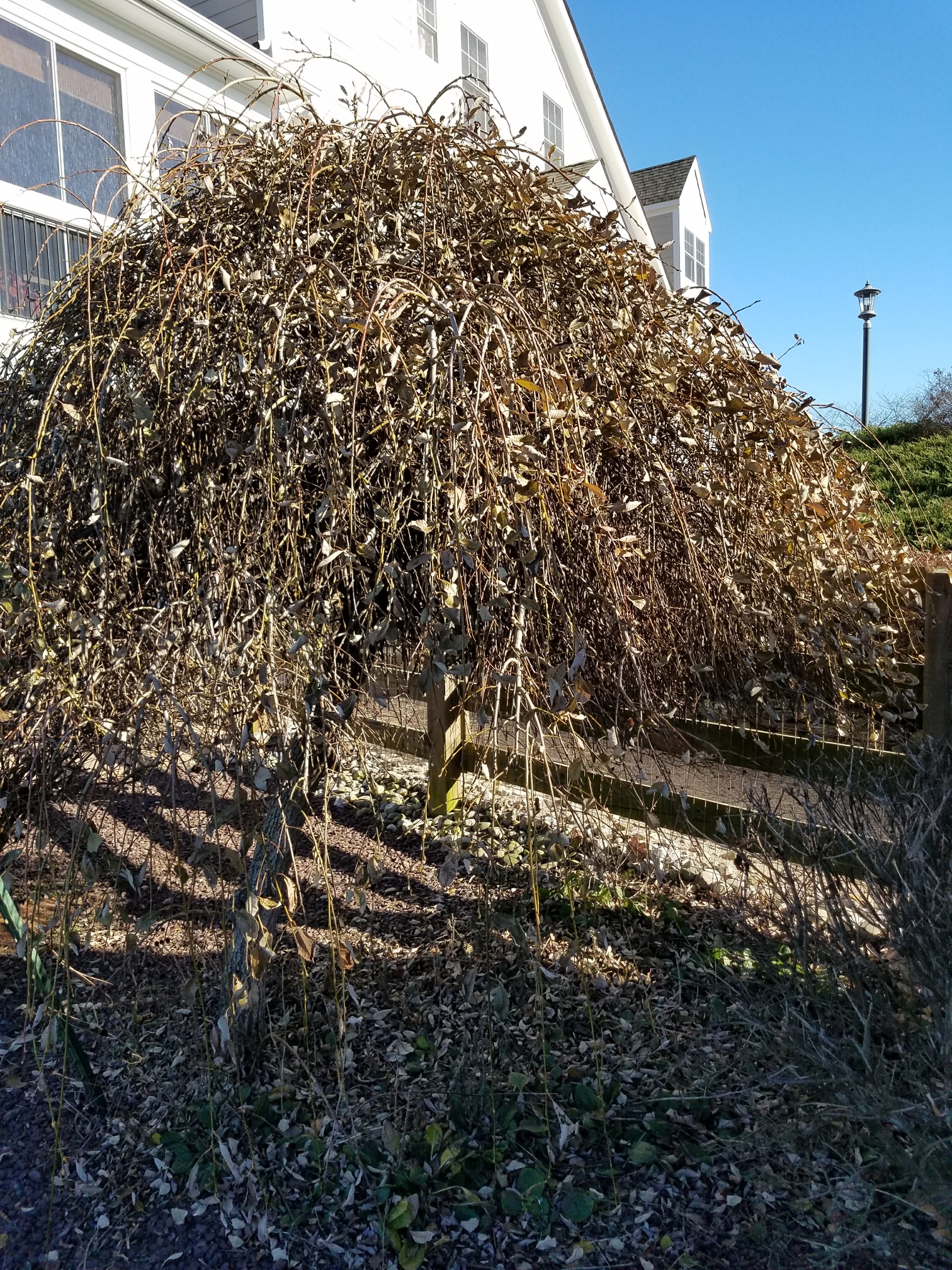 - Weeping forms. Any weeping form of tree or shrub can make a dramatic focal point or accent in the winter landscape. The cascading branches and foliage add delightful grace notes and a pleasing contrast to more upright species. Although very few trees have a naturally weeping form, mutations of both deciduous and evergreen trees have resulted in a number of weeping selections. A few examples include: Redbud (Cercis), flowering cherry (Prunus species), Japanese maple (Acer dissectum species), umbrella elm (Ulmus), and willow (Salix).