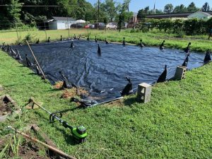 The regrowth made it clear that we needed to change our tactics. The photo above illustrates our new attack. A test section of the garden was string-trimmed close to soil level, then covered with a silage tarp that is held in place with sandbags (this is called occultation). The tarp was put in place in late September and will remain there until spring, the goal being to starve the rhizomes of water and sunlight while heating up the soil, hopefully enough to weaken them further. While this is a new method for us, we are hopeful that it will have an impact on the tarped section next year. Stay tuned.