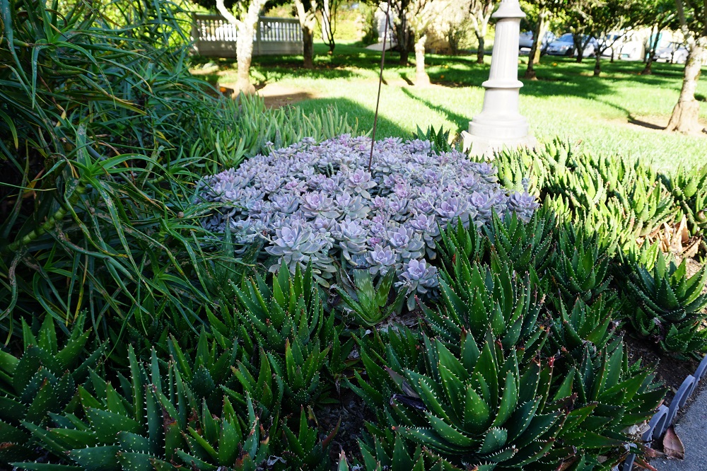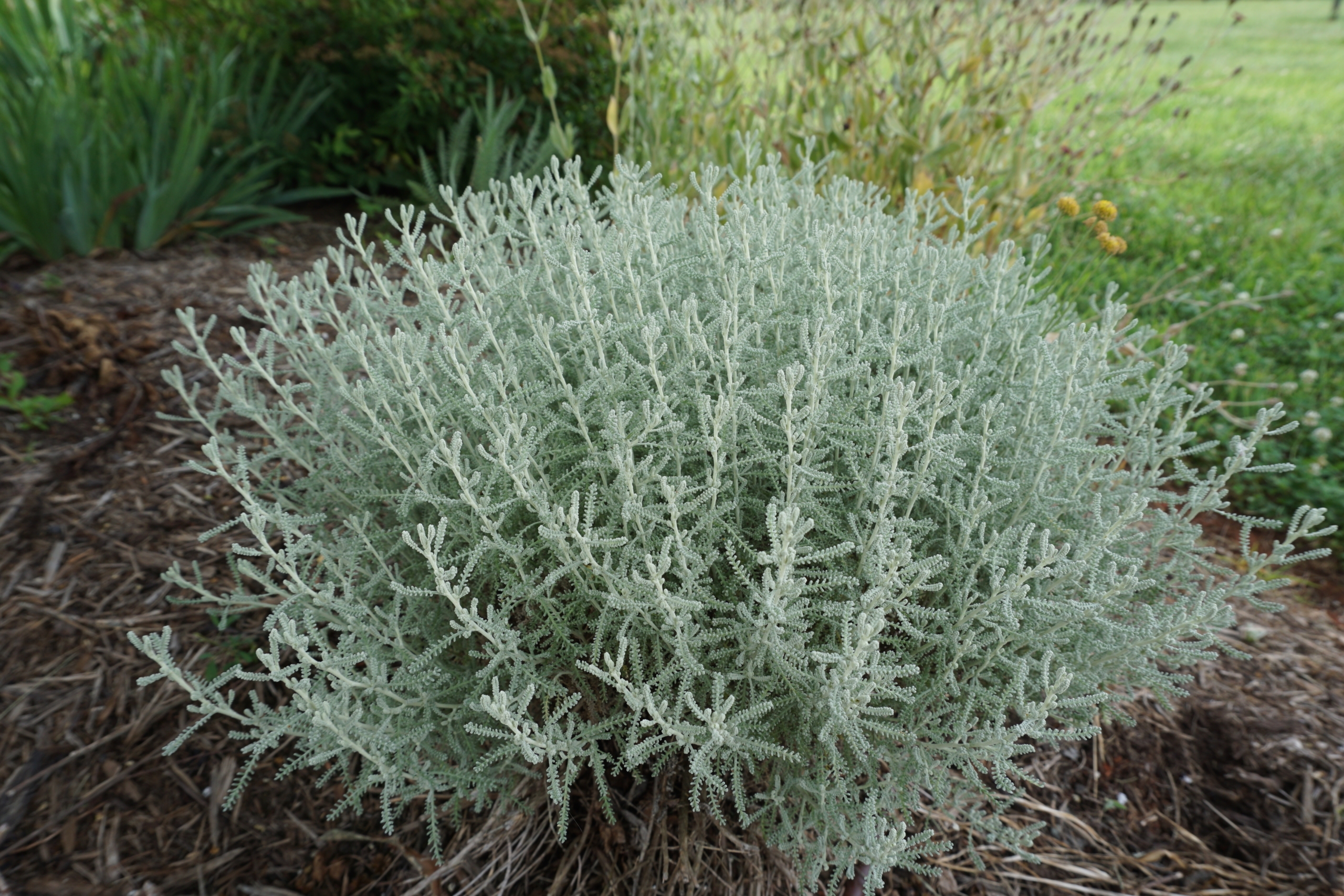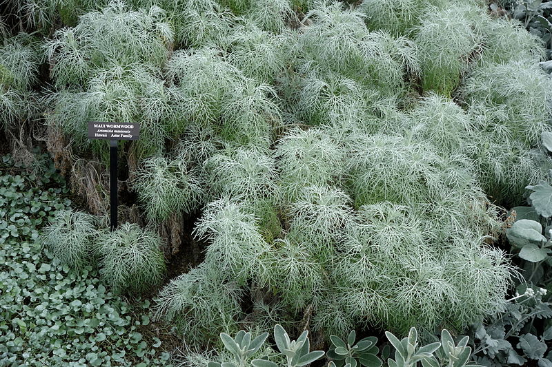 Display of Drought-tolerant Artemisia, Dicondra argentea, and Salvia species at Longwood Gardens Gray or silver-hued foliage – This characteristic is normally a good indication that the plant evolved to withstand drought conditions. Examples of plants with gray or silvery foliage include wormwood (Artemisia), silver ponyfoot (Dicondra argentea), sea holly (Eryngium), lavender cotton (Santolina chamaecyperissus), snow-in-summer (Cerastium tomentosum), Russian sage (Perovskia), and many succulents and cacti.