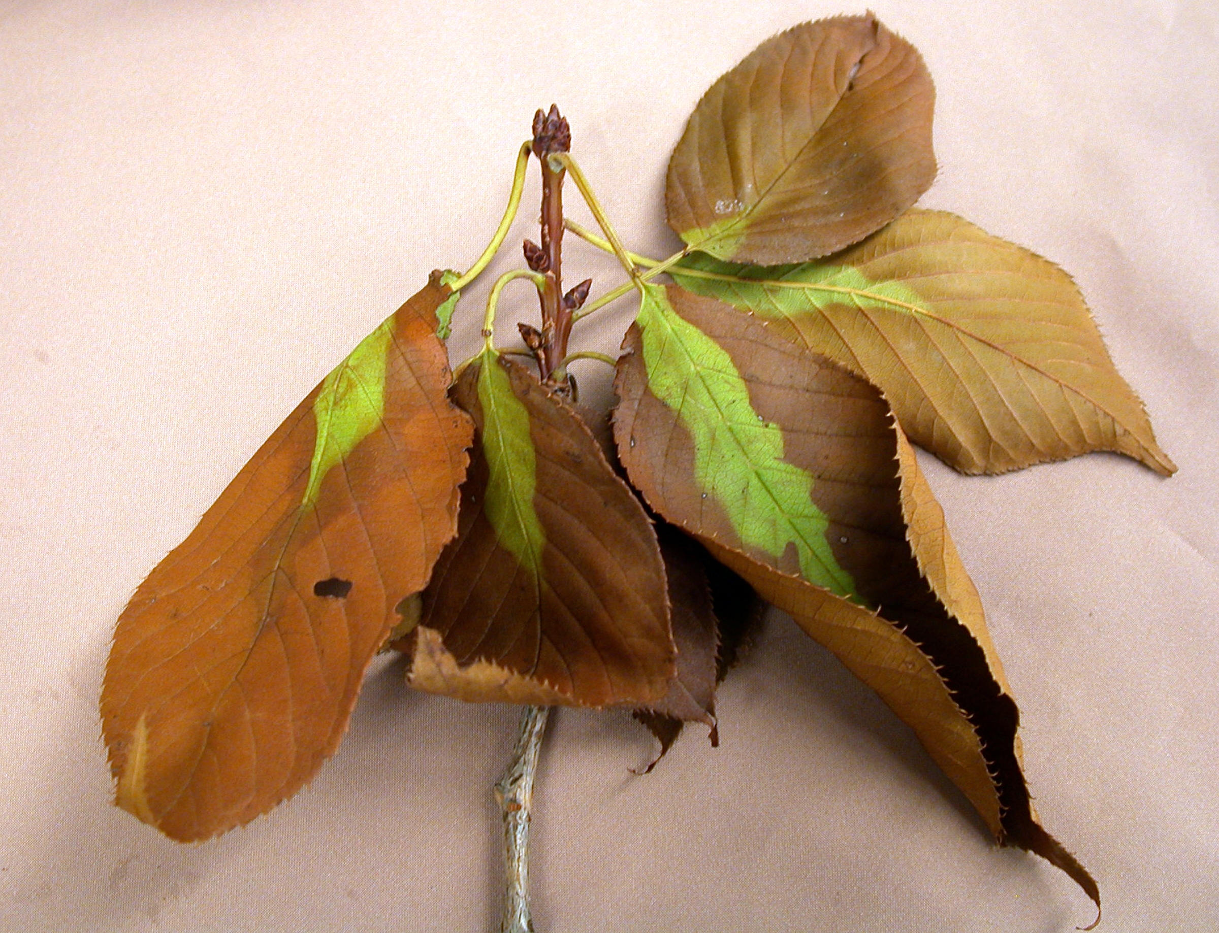 Leaf Scorch It is commonly observed on deciduous trees, such as maples, oaks, lindens, horse chestnuts, dogwoods and Japanese maples, and on broad-leaved evergreen plants such as magnolias, rhododendrons, hollies, and Japanese Andromeda (Pieris japonica). Leaf scorch may be the result of a combination of factors, including high temperatures, drying winds, and low soil moisture.