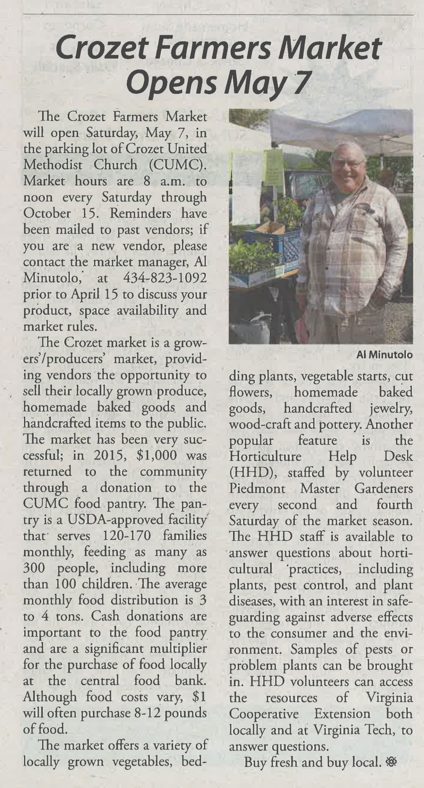 Here is the article about the market and Horticulture Help Desk published in the Crozet Gazette.