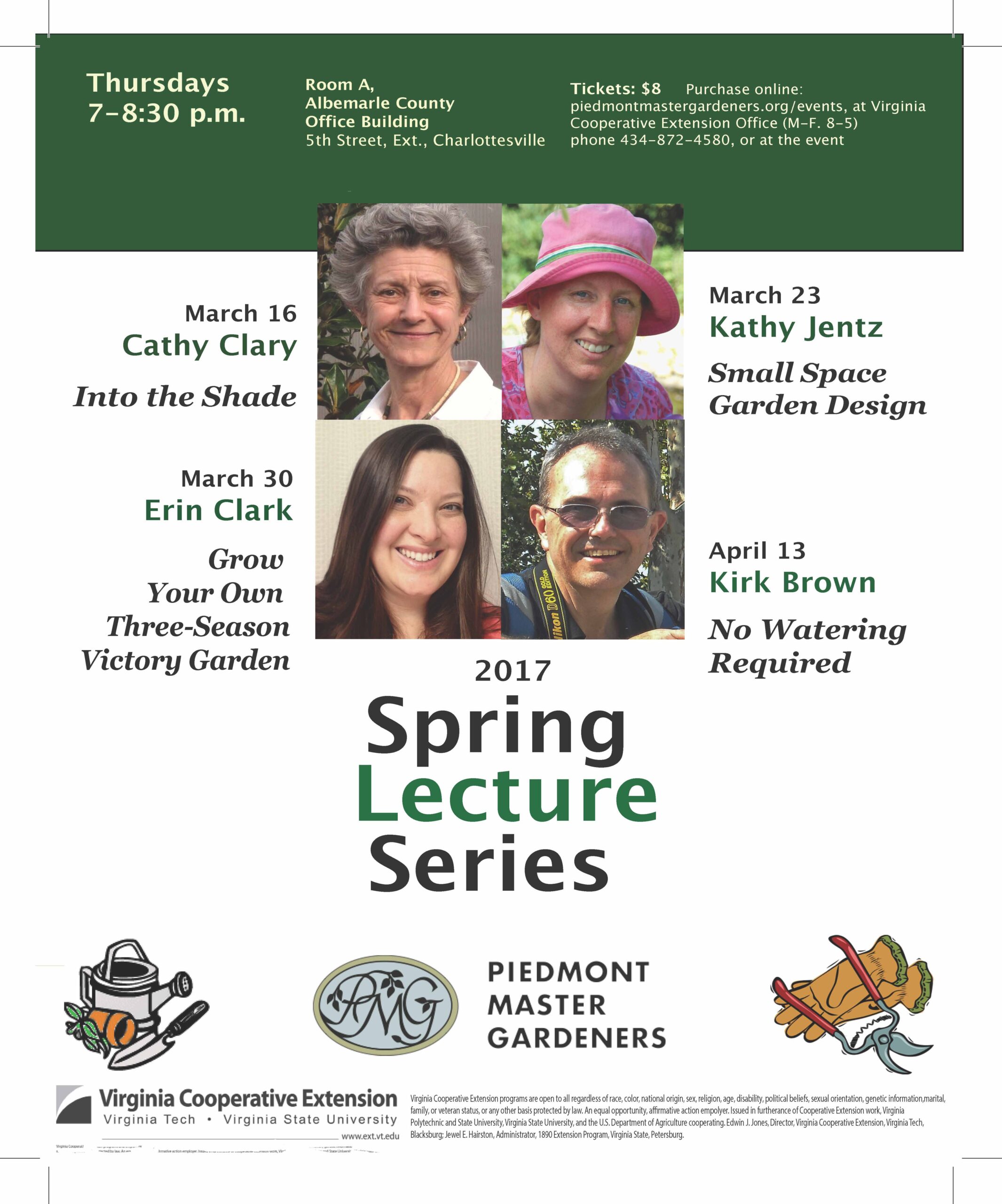 Piedmont Master Gardeners, in cooperation with the Virginia Cooperative Extension Service, invite you to the 2017 Spring Garden Lecture Series, starting in March!